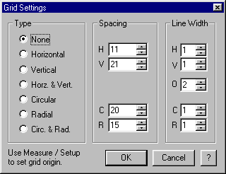 Grid allows you to set up a grid that overlays the movie image. The types of grids are horizontal and vertical lines or circular and radial arcs. The line width of the grid is set in the Grid Settings dialog box, and the color of the grid lines is set by the selected drawing color.