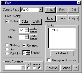 Each path must have a name. This first time a path is setup on a movie, a dialog box prompts for this name. If a second path is used, for instance when one path is a golfers backswing and the second is the downswing, the second path must be setup and given a name.
