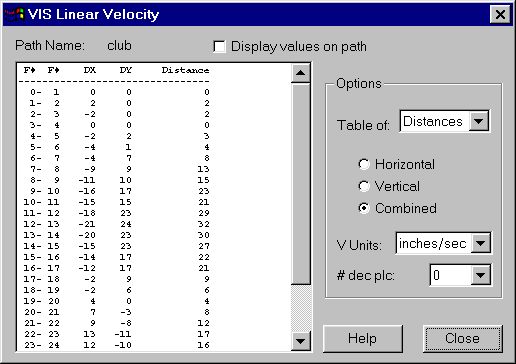 Analyze will show the x and y positions of each point on the trace. Under the Options section, Table of: shows either point positions, distance in x and Y and total between consecutive points, and velocity based on the distance measurement and frame rate.