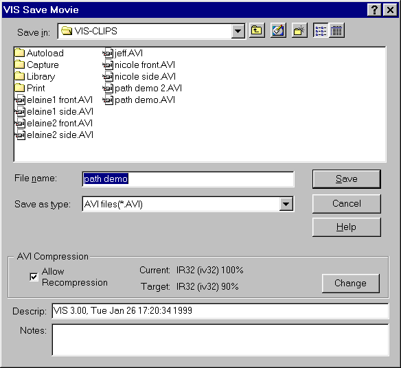 AVI compression allows you to reduce the size of your movie file. Depending on the compression routine selected, the quality of the movie may be affected. To select a video compression routine, click on Change in the AVI Compression section of the VIS Save Movie Dialog box. You will see the AVI Compression box, and can choose your compression routine.