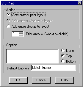 Selecting Print brings up the VIS Print dialog box. The Action part of box gives you choices about viewing and adding your image to the print layout. You choose your print layout action and then click on OK. All of the choices take you to the print layout page.
