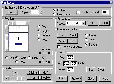 Print areas can be moved around on the page by first selecting the area to be positioned by either clicking on it in the preview area or by choosing it from the list of print areas. Once a print area is selected, you can drag it with mouse or use the scroll bars to move it. Accurate positioning to the center or extremes of the paper can be made by selecting the appropriate positioning buttons.