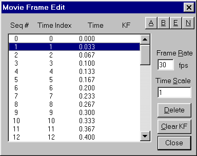 The A-B-E-N buttons select groups of frames. To use these buttons to select groups of frames, select the frame of interest by clicking on it with the left mouse button. The A button selects alternate frames to easily allow you to remove every other frame. The B button selects from the highlighted frame to the beginning, the E button selects from the highlighted frame to the end, and the N button selects all frames.