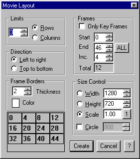 Layout is primarily used in two ways. First, if you typically set key frames that show the important frames of the movie, you will most likely set Only Key Frames to on in the Frames section. Then you can set the display by specifying the rows or column in the Limits section.